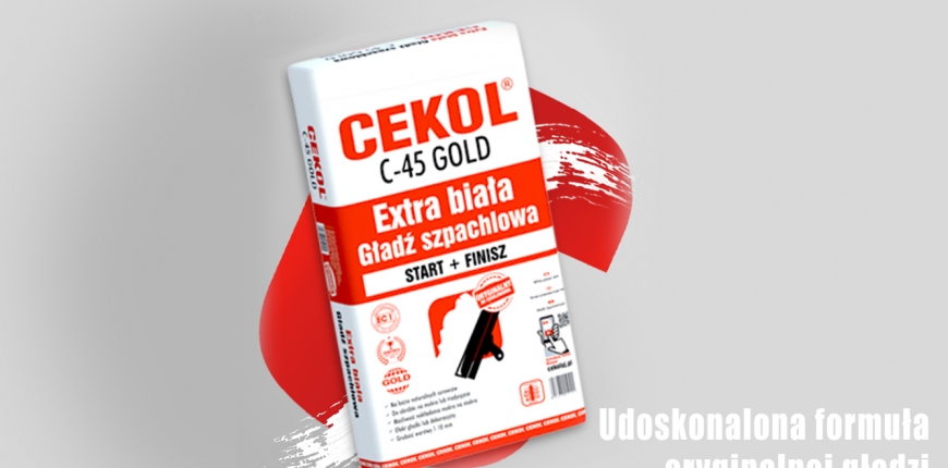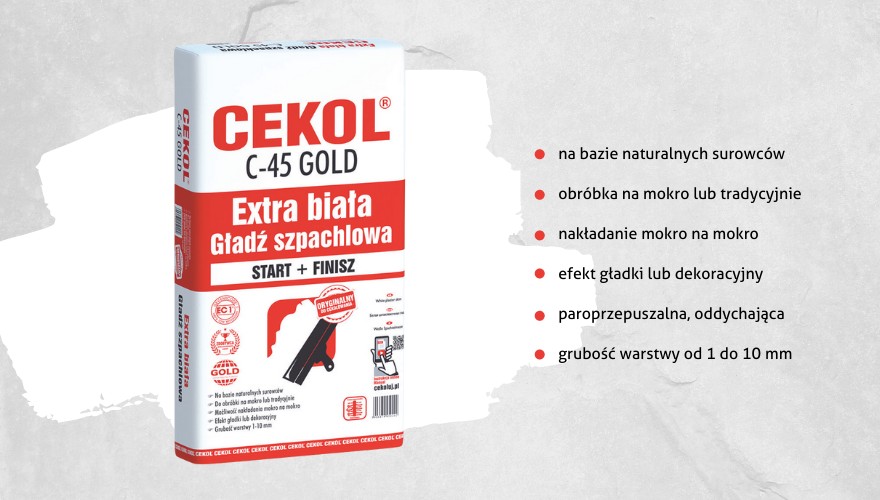 Extra biała szpachla gipsowa CEKOL C-45 GOLD miała stać się produktem łatwym i przyjemnym w całym procesie szpachlowania: od nałożenia, poprzez obróbkę, aż do finalnego efektu. Dlatego też wprowadzono do niej szereg udoskonaleń, między innym produkt zyskał możliwość nakładania „mokro na mokro”, co znacząco skraca czas pracy, a sama gładź daje się szlifować metodą „na mokro”, niwelując ilość kurzu podczas prac wykończeniowych. Tym samym gładź na mokro to idealny wybór zarówno na start do przygotowania podłoża, jak i na finisz, na ostateczne wygładzenie pod wszelkie rodzaje farb i tapet. Ponadto dzięki miesiącom badań oraz prób udało nam się uzyskać certyfikat EC1+, świadczący o tym, że masa szpachlowa CEKOL C-45 GOLD to produkt nie tylko innowacyjny, ale i ekologiczny. Cekol C-45 posiada szczególnie niską emisyjność szkodliwych dla zdrowia substancji, podczas każdego etapu prac z gładzią.