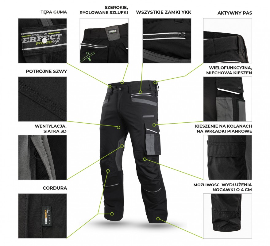 Odzież robocza dedykowana najbardziej wymagającym użytkownikom. Już na pierwszy rzut oka zaskakuje modną stylistyką i estetycznym wykonaniem. Ubiór powstał przy współpracy z profesjonalistami z branż dla których spodnie są dedykowane, dlatego każdy szczegół idealnie spełnia swoją funkcję. Do szycia spodni wykorzystano wysokiej jakości elastyczny materiał o charakterystyce softshellu. Dodatkowo w spodniach zamontowano aktywny pas z podwyższonym stanem z tyłu. Dzięki temu komfort użytkowania jest wysoki nawet przy wielogodzinnej pracy w wymuszonej pozycji. Dodatkowo wykonano otwory wentylacyjne odpinane na zamek, które pozwalają na wypuszczanie nadmiaru wilgoci i ciepła.