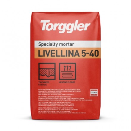 LIVELLINA 5-40 jest przygotowywaną w zakładzie samopoziomującą zaprawą o kolorze szarym na bazie specjalnych cementów, wyselekcjonowanych wypełniaczy, żywic syntetycznych i specjalnych dodatków. Po wymieszaniu z wodą uzyskuje się doskonale płynną, samorozlewną masę, która nie ulega sedymentacji, rozsegregowywaniu składników lub wypieraniu lekkich frakcji na powierzchnię. Masę można nakładać w warstwach o grubości od 5 mm do 40 mm. Związana wylewka charakteryzuje się doskonałą przyczepnością do podłoża, jest odporna na uderzenia i ścieranie, posiada gładką i wolną od pyłu powierzchnię. Produkt nie zawiera upłynniaczy na bazie substancji białkowych lub związków, które mogą uwalniać formaldehyd albo amoniak. Dzięki zastosowaniu specjalnych polimerów zminimalizowano emisję lotnych związków organicznych. Zgodnie z EN 13813 LIVELLINA 5-40 należy do klasy CT-C30-F6.